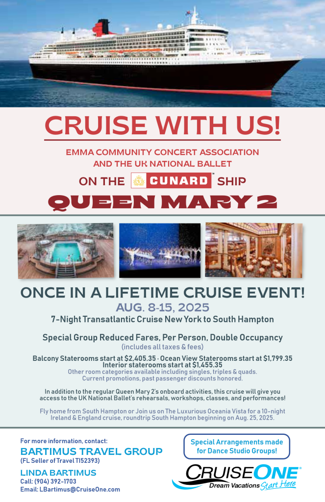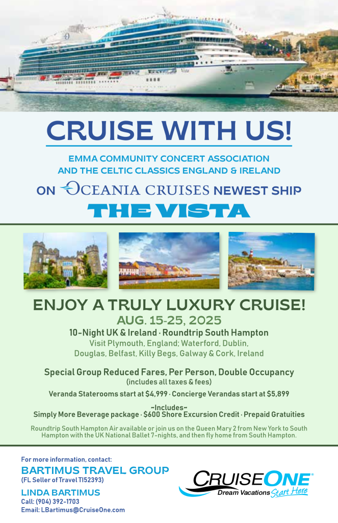 Two 2025 cruises with EMMA! For more information and to book either amazing cruise that benefits EMMA Concert Association, please contact Linda Bartimus at Cruise One at 904-392-1703 or by email LBartimus@cruiseone.com