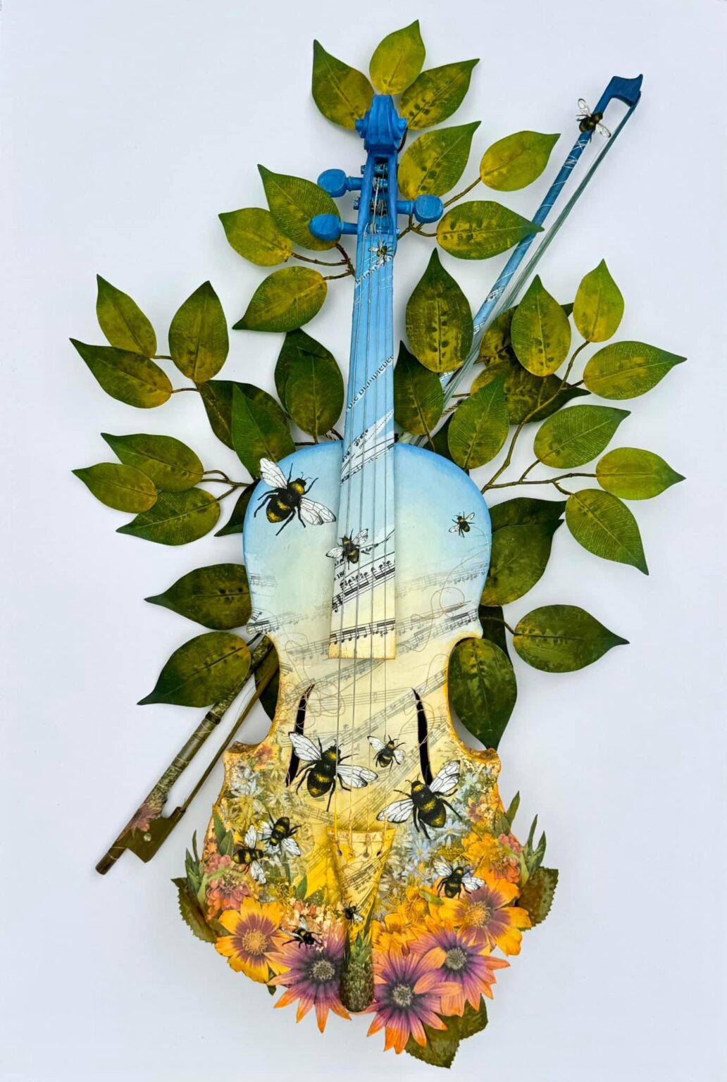 What’s the buzz behind “Flight of the Bumblebees”, mixed media collage/assemblage of a violin? It is a sweet collaboration between husband and wife team Bo Sterk and Jo Sinclair. Inspired by the famous orchestral interlude of his opera The Tale of Tsar Saltan, by Nikolai Rimsky-Korsakov, Bo and Jo saw the opportunity to combine their talents in this bee-utifully decorated violin. As the sheet music flys around the sky of the image, the violin is enveloped in a garden setting of collaged photographs of flowers by Jo, and buzzing pen and ink drawings of bumblebees. (Clarification: A bumblebee is not the same as a honeybee. One difference? It’s larger and fuzzier.)